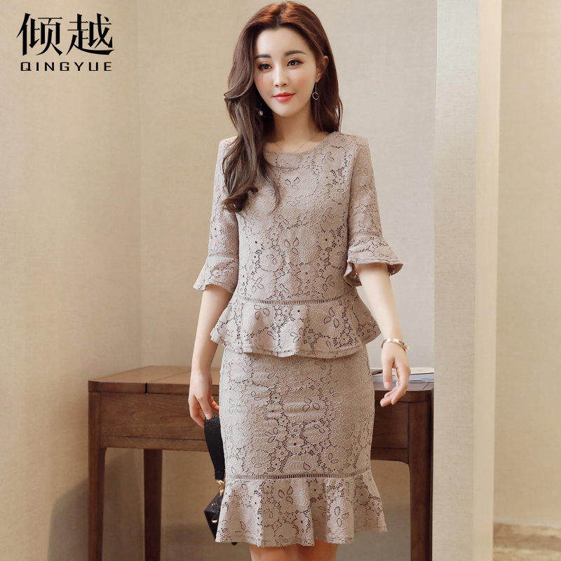 傾越2017春夏裝新款女套裝裙蕾絲長袖包臀魚尾裙修身兩件套連衣裙