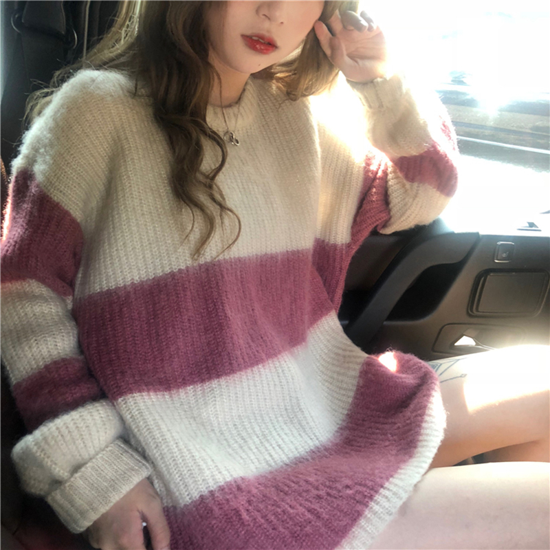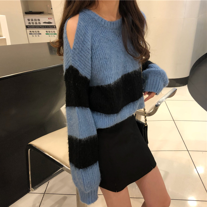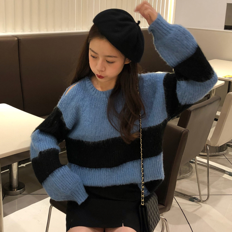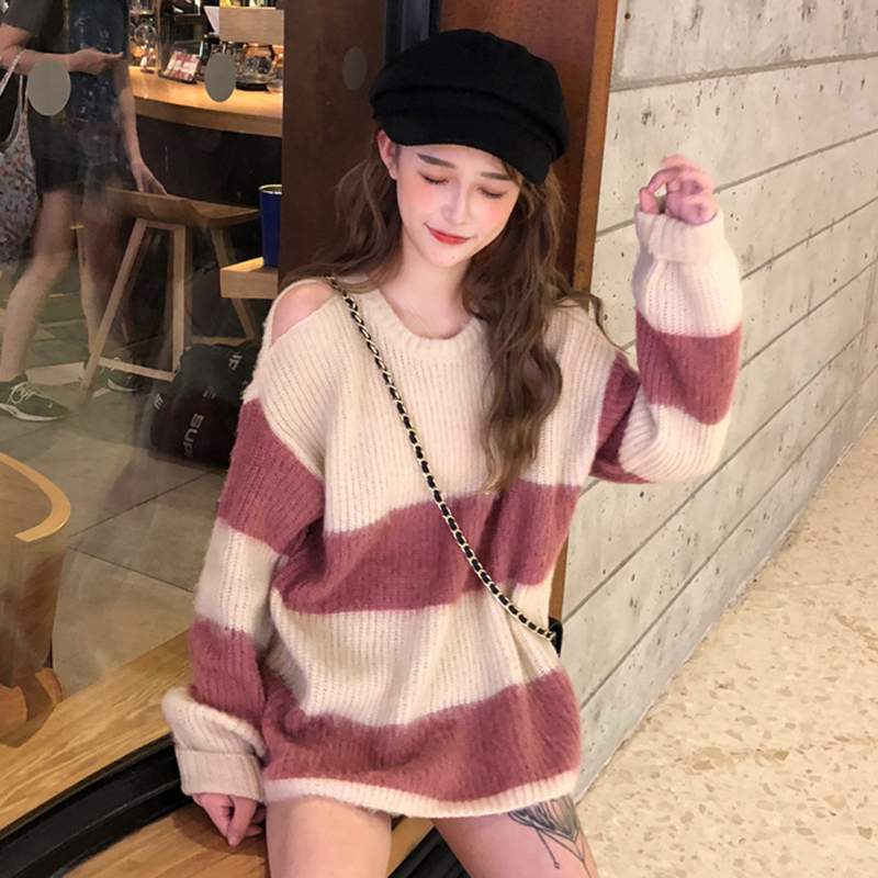 / 秋裝女2018新款韓版慵懶寬松長袖條紋毛衣學生個性露肩圓領上衣潮