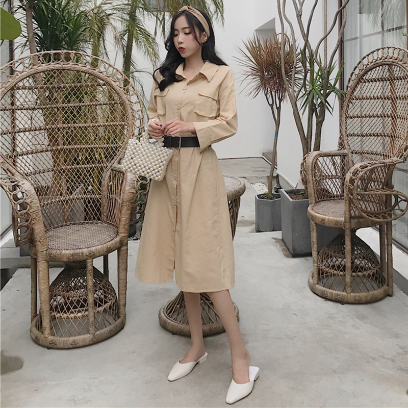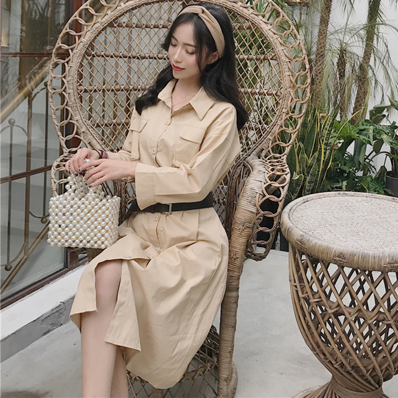 / 純色寬松長袖襯衫連衣裙子女秋冬裝新款學生法式復古egg風中長裙