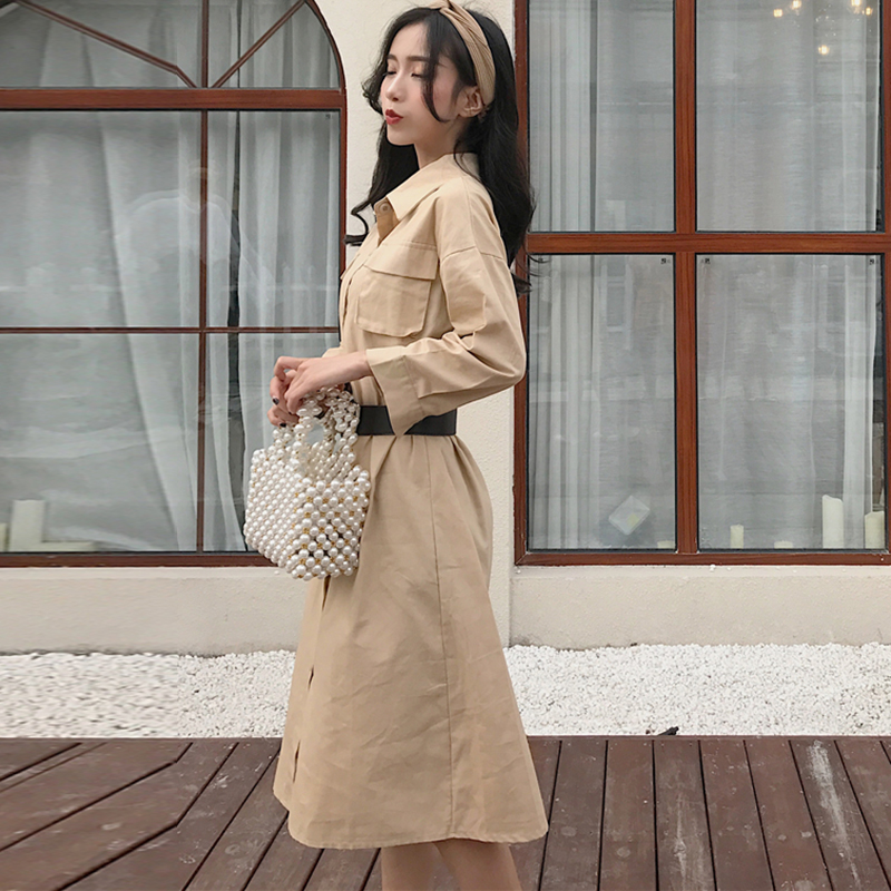 純色寬松長袖襯衫連衣裙子女秋冬裝新款學生法式復古egg風中長裙