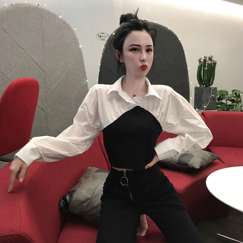 / 2018秋季新款女裝韓版時尚撞色襯衫修身顯瘦長袖上衣翻領短款襯衣