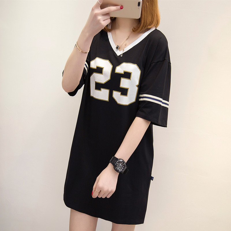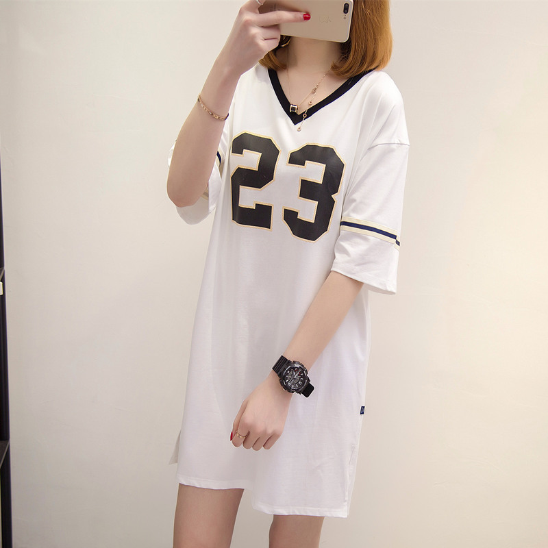 / 夏季女裝新款中長款V領中長款t恤女短袖寬松上衣女百搭體恤衫