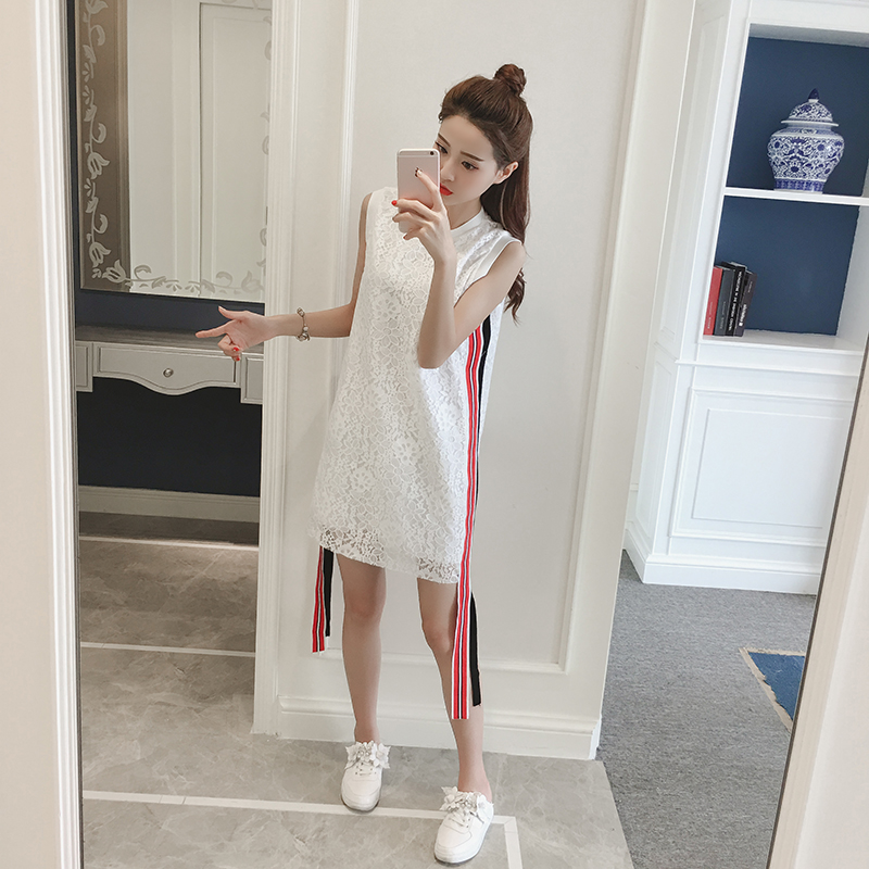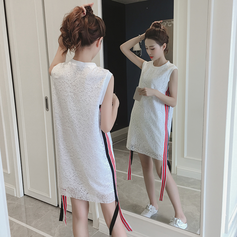 / 夏季新款女裝韓版時尚織帶裙子中長款顯瘦無袖蕾絲連衣裙女夏