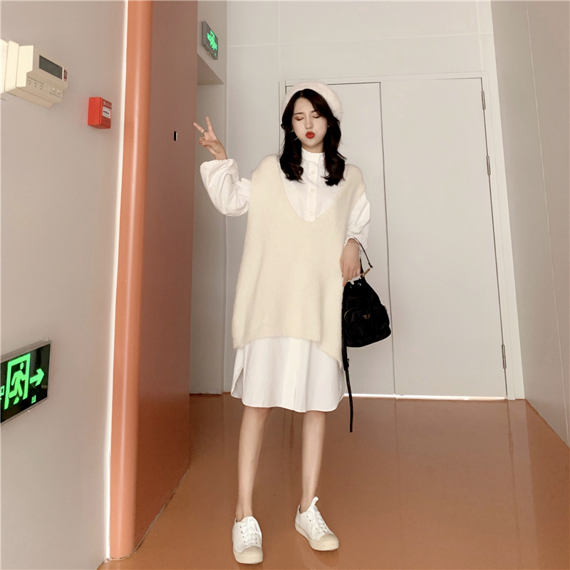 / 秋裝女2018新款厚實基礎長款襯衫+慵懶寬松V領毛衣背心馬甲兩件套