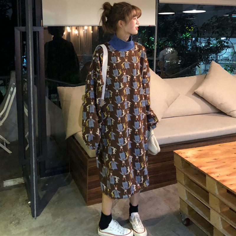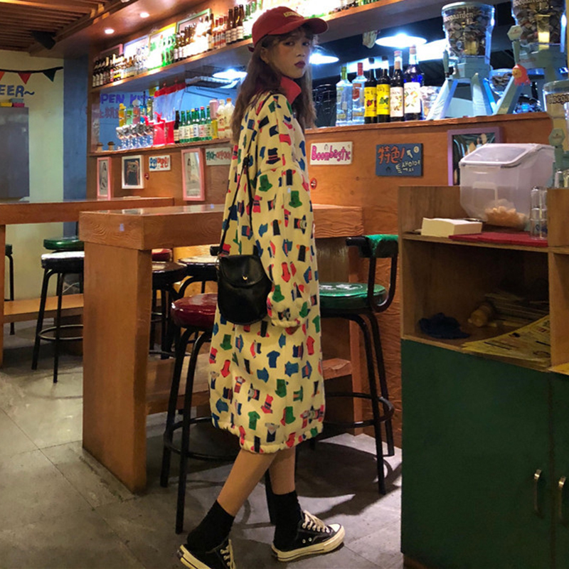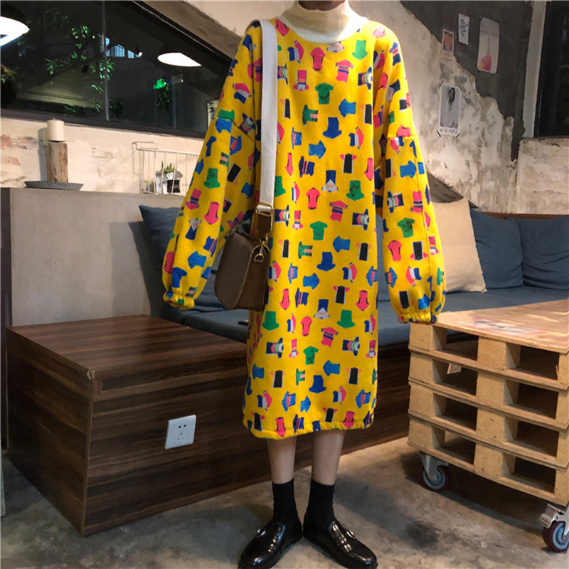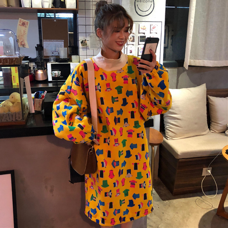 時尚涂鴉印花加絨衛衣女秋冬裝2018新款學生韓版寬松中長款外套潮