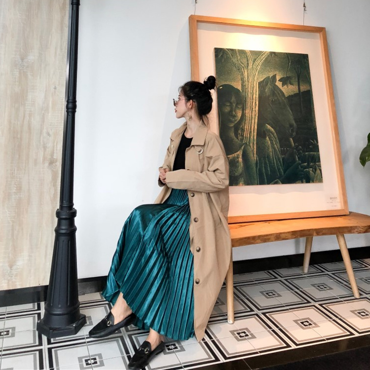 秋裝女2018新款套裝中長款風衣外套+長袖打底衫+壓皺半身裙三件套