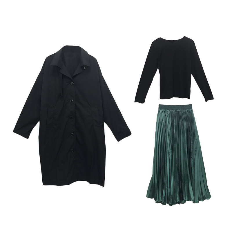 卡其外套|黑色外套|綠色半身裙|黑色打底衫