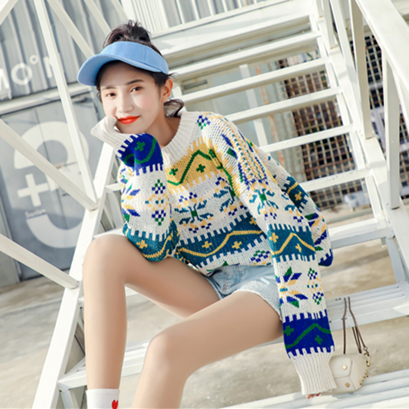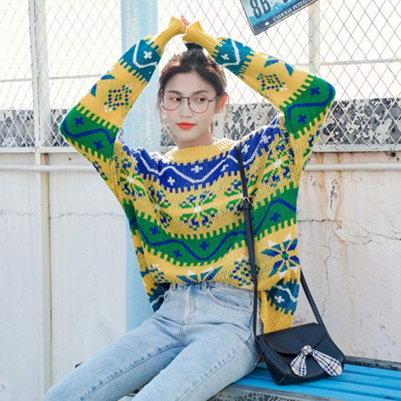時尚提花圓領慵懶毛衣秋裝女2018新款寬松長袖套頭針織衫休閑上衣