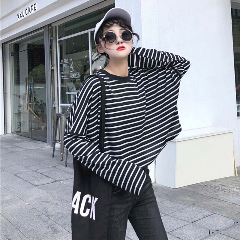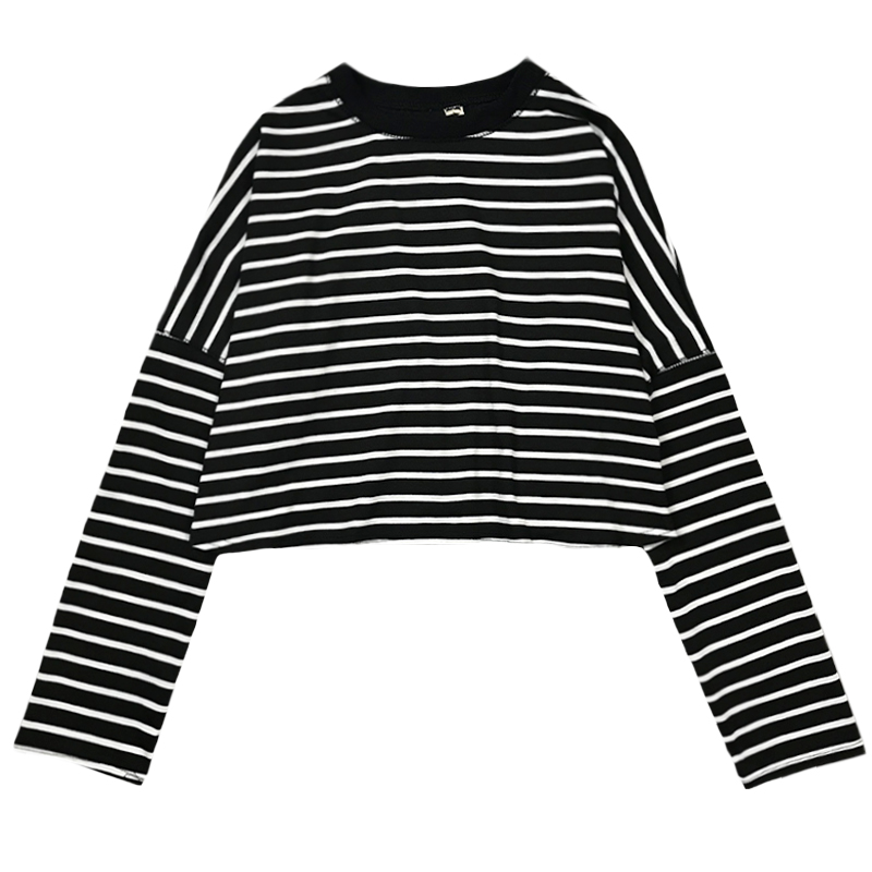秋裝女2018新款學生黑白條紋長袖T恤韓版寬松短款露臍上衣打底衫