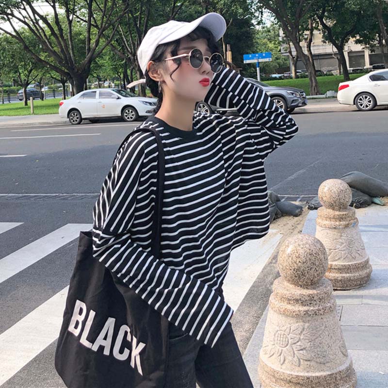 / 秋裝女2018新款學生黑白條紋長袖T恤韓版寬松短款露臍上衣打底衫
