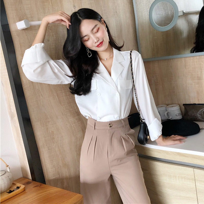 / 秋裝2018新款韓版氣質西裝領長袖白襯衫寬松顯瘦薄款女生時尚上衣