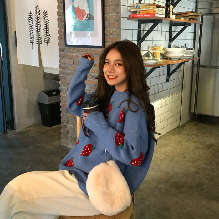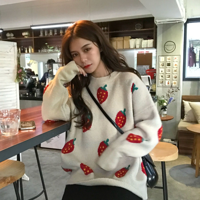 / 草莓提花寬松圓領加厚保暖慵懶風套頭毛衣女2018新款秋冬長袖上衣