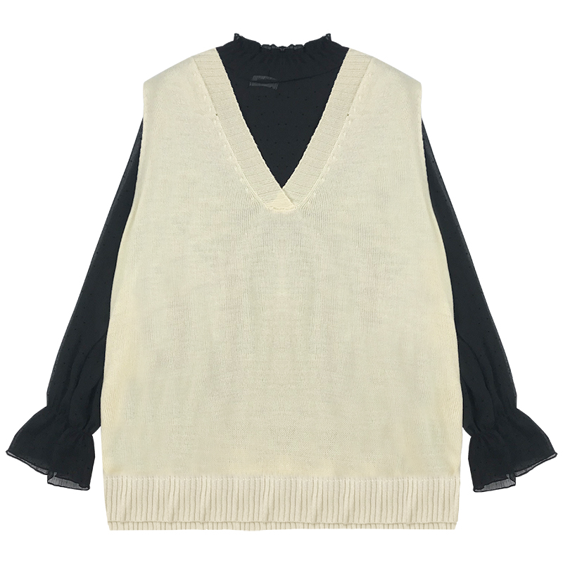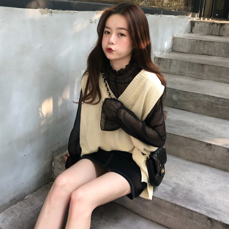 洋氣兩件套女秋冬新款學生V領針織毛衣馬甲透視波點長袖打底襯衫