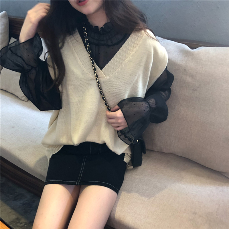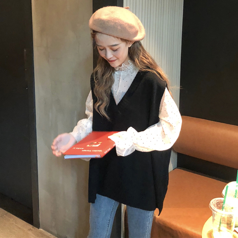 / 洋氣兩件套女秋冬新款學生V領針織毛衣馬甲透視波點長袖打底襯衫