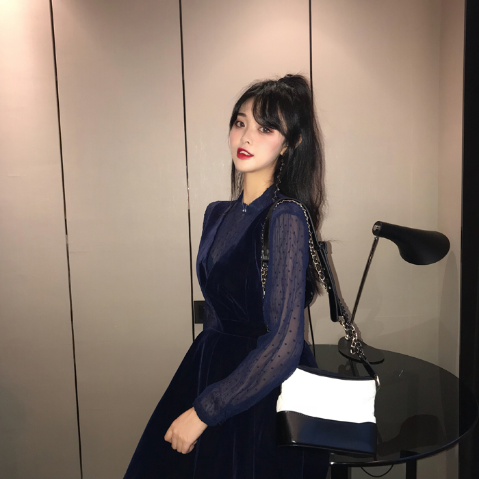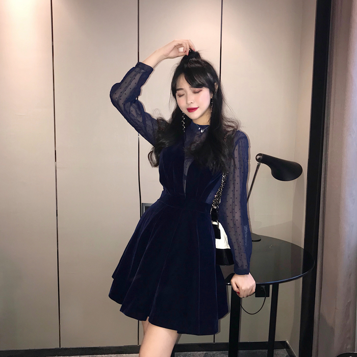 / 復古秋裝女新款圓點提花網紗打底T+絲絨收腰顯瘦V領背心連衣裙女