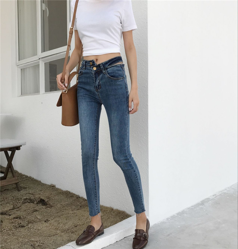 秋季新款復古韓國不規則高腰顯瘦百搭小腳褲水洗做舊九分牛仔褲潮