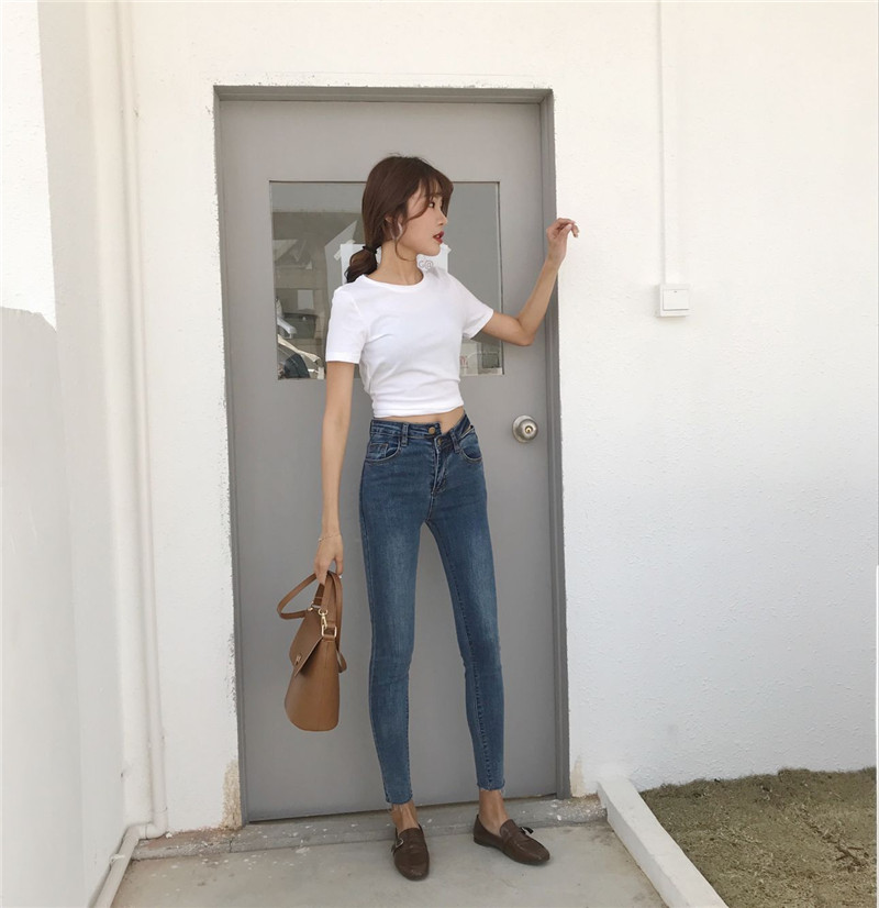 時尚復古彈力高腰修身九分水洗牛仔褲女春秋2018新款韓版顯瘦褲子