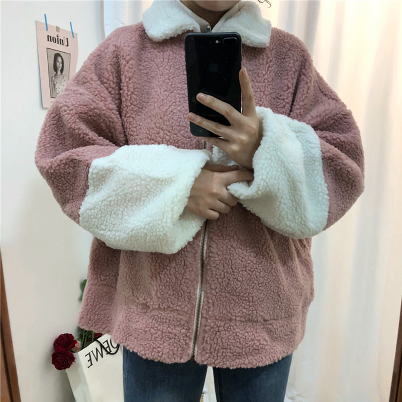 / 時尚拼色羊羔毛外套秋冬女裝2018新款港風保暖開衫寬松長袖上衣潮