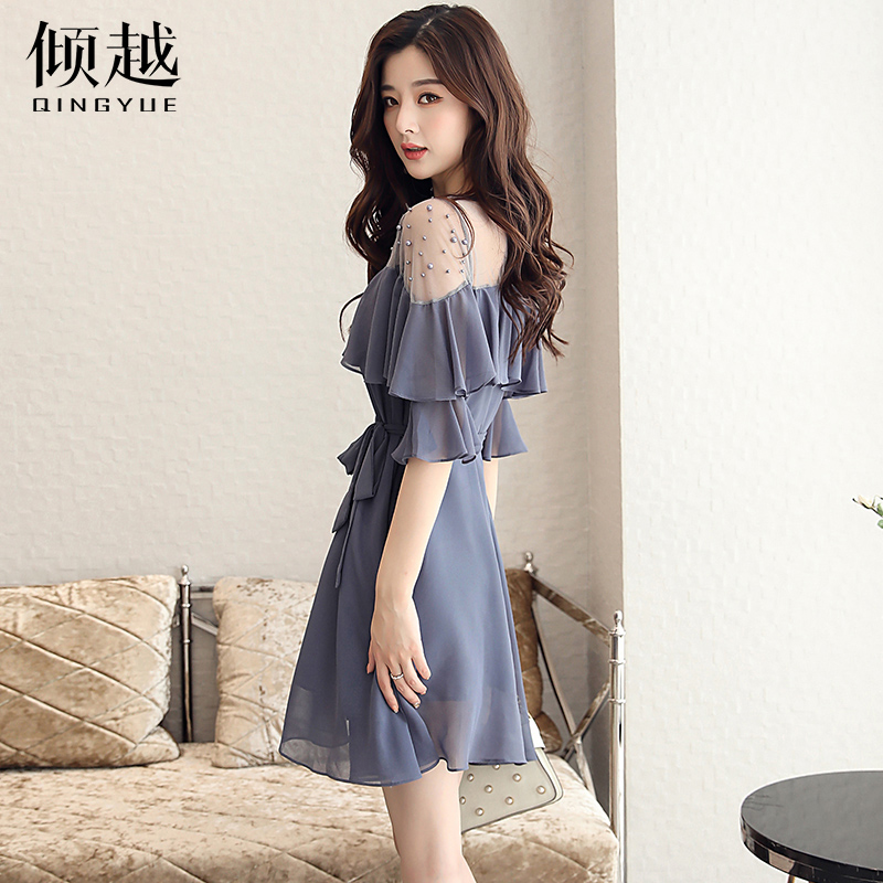 2017夏季新款甜美圓領短袖a字裙顯瘦修身氣質網紗拼接純色連衣裙