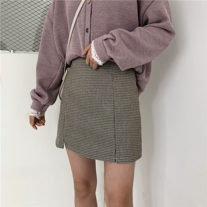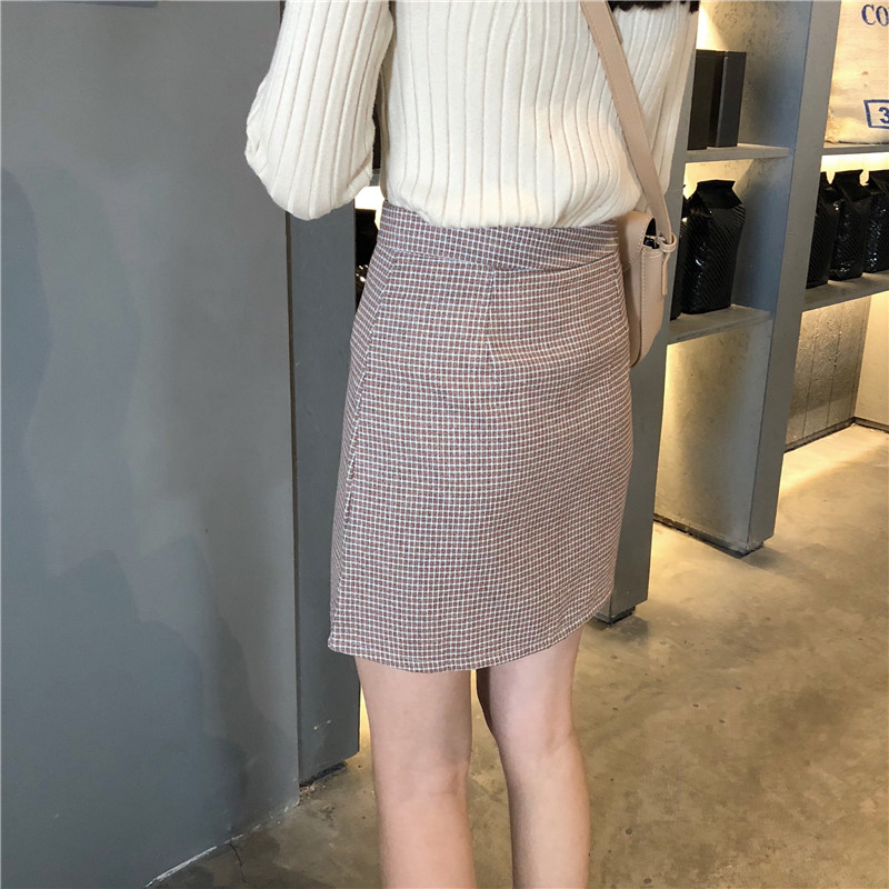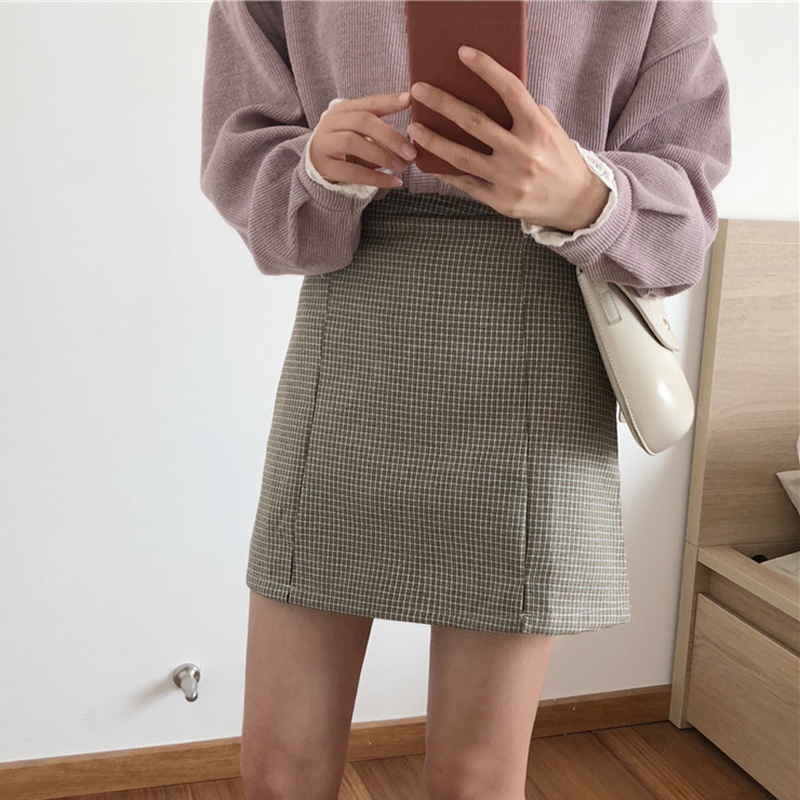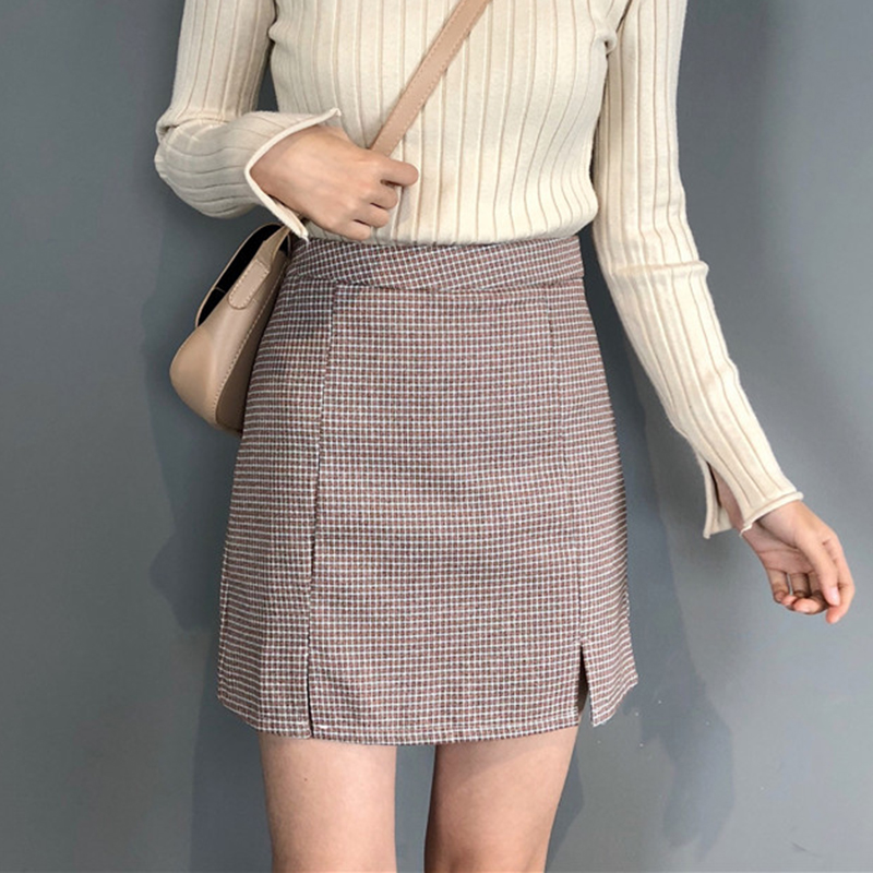 / 復古格子半身裙女秋冬裝2018新款高腰開叉包臀裙修身顯瘦毛呢短裙