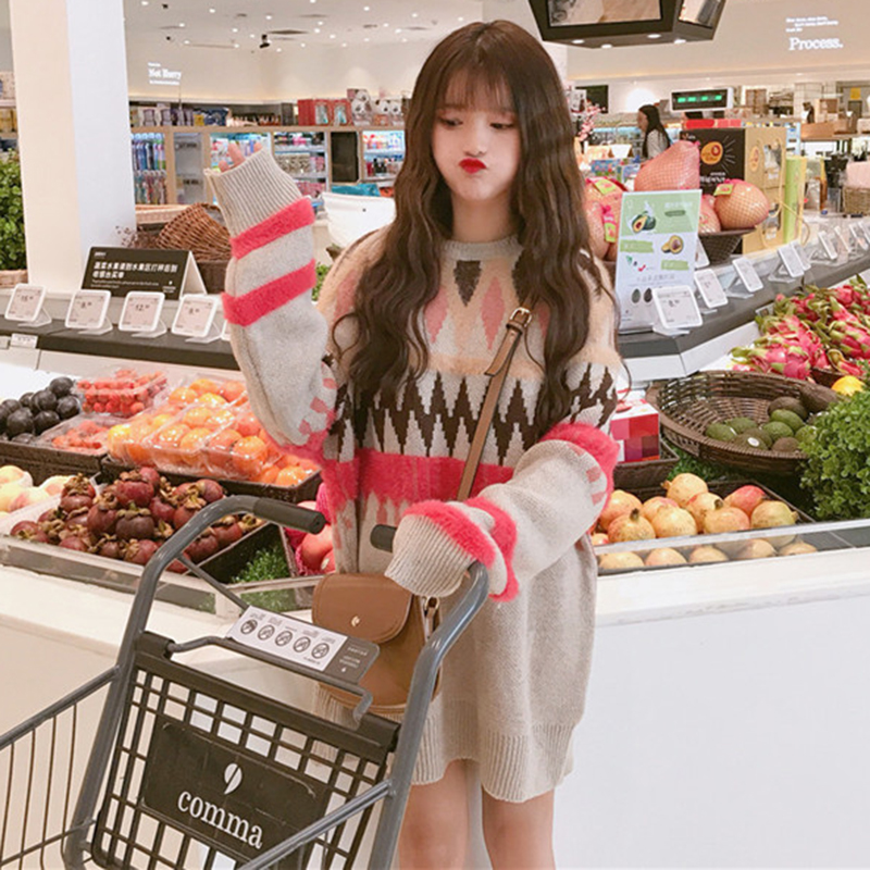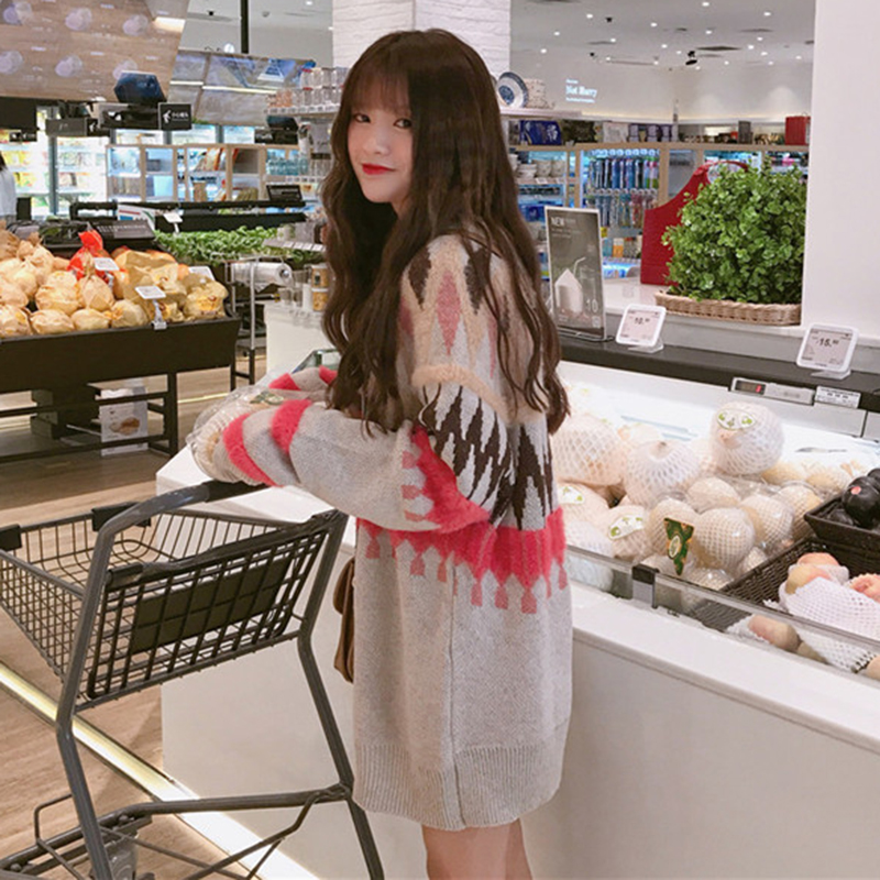 / 學院風長袖毛衣秋裝女2018新款韓版中長款拼色外套慵懶寬松上衣潮