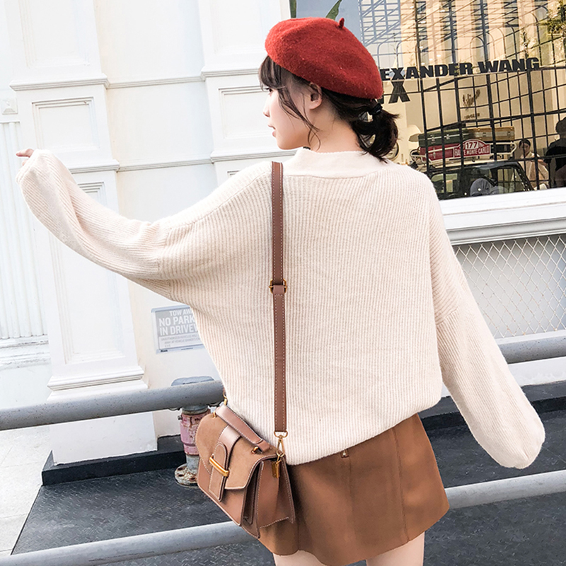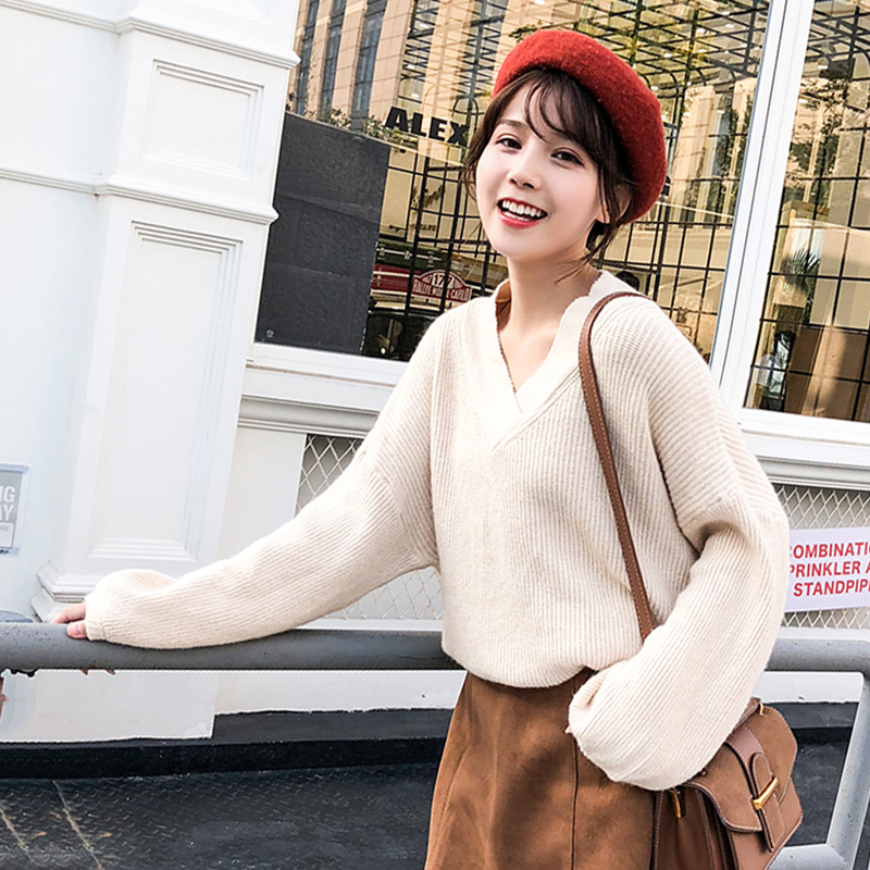/ 慵懶休閑純色毛衣秋裝女2018新款甜美學生長袖V領上衣簡約針織衫