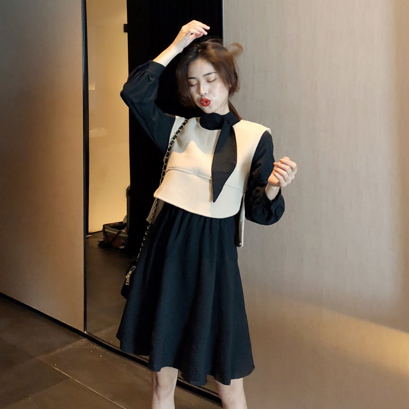秋裝女2018新款套裝時尚呢子馬甲女+高腰中長款連衣裙網紅兩件套