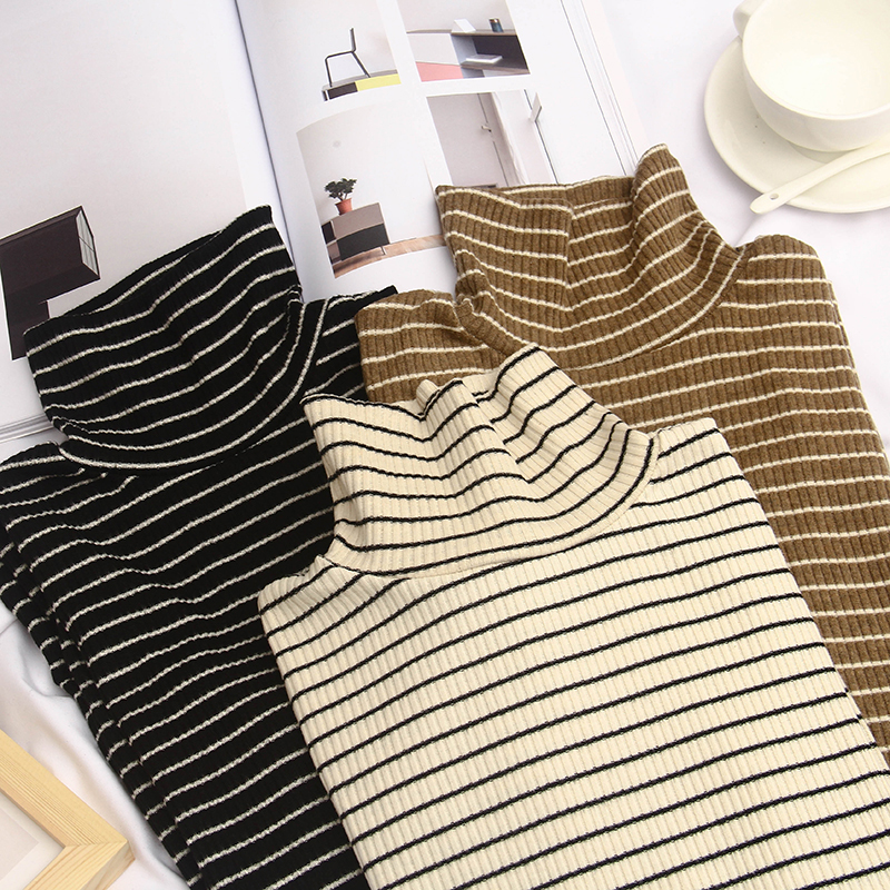 / 高領修身顯瘦打底衫女秋冬裝新款學院風條紋長袖上衣外穿套頭T恤