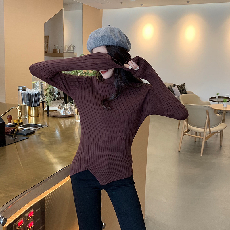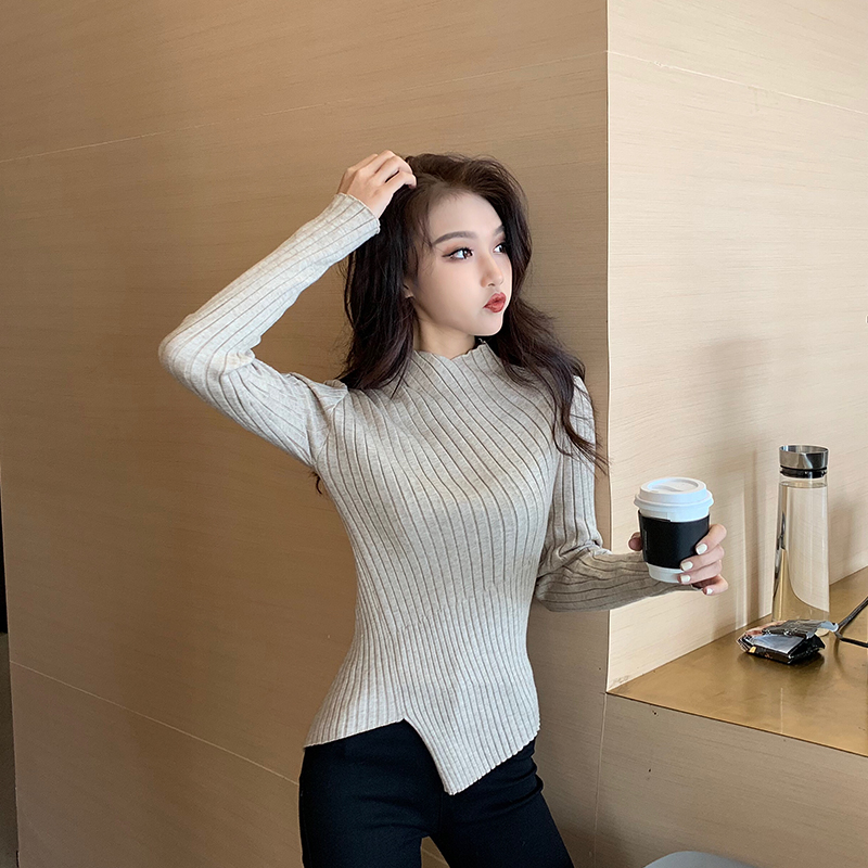 / 復古chic新款韓版百搭修身顯瘦不規則邊針織打底加厚保暖純色毛衣