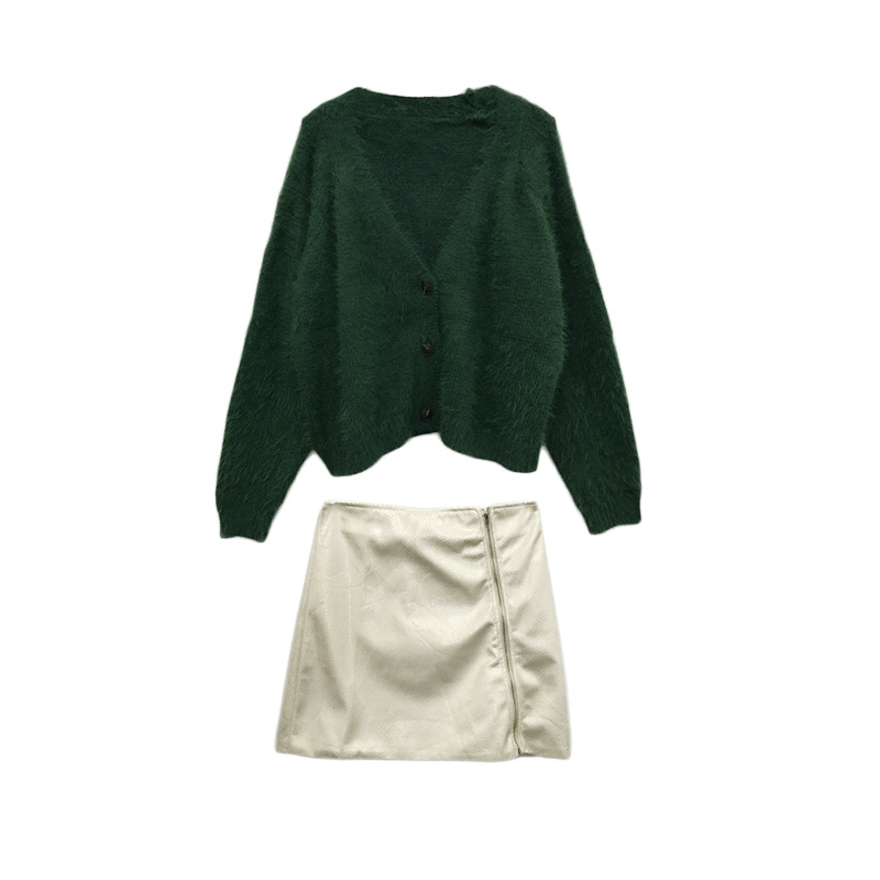 綠色毛衣|杏色皮裙