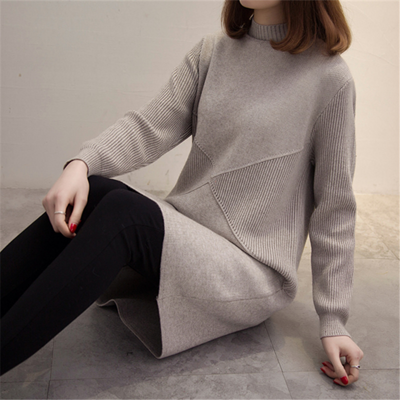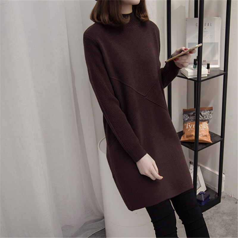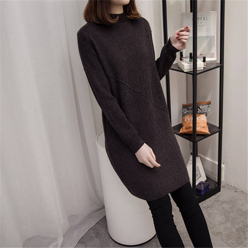 新款潮毛衣裙女半高領套頭純色中長款秋冬季打底衫螺紋寬松針織衫