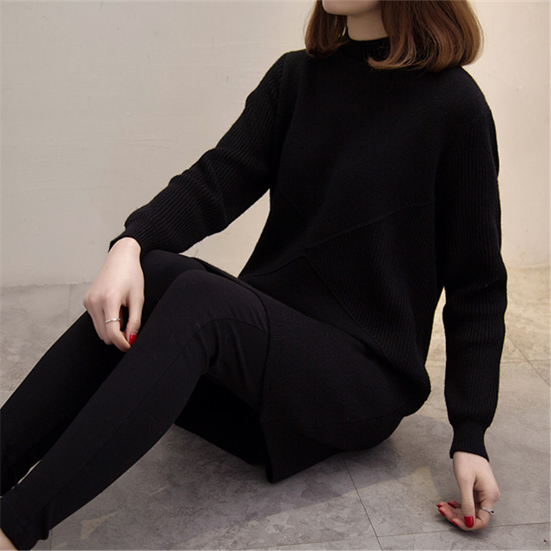 / 新款潮毛衣裙女半高領套頭純色中長款秋冬季打底衫螺紋寬松針織衫