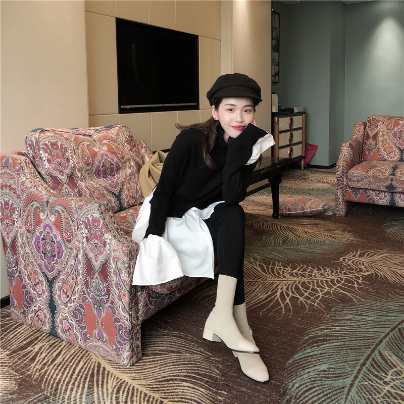 / 韓版毛衣女2018新款假兩件拼色半高領不規則喇叭袖襯衫針織衫上衣