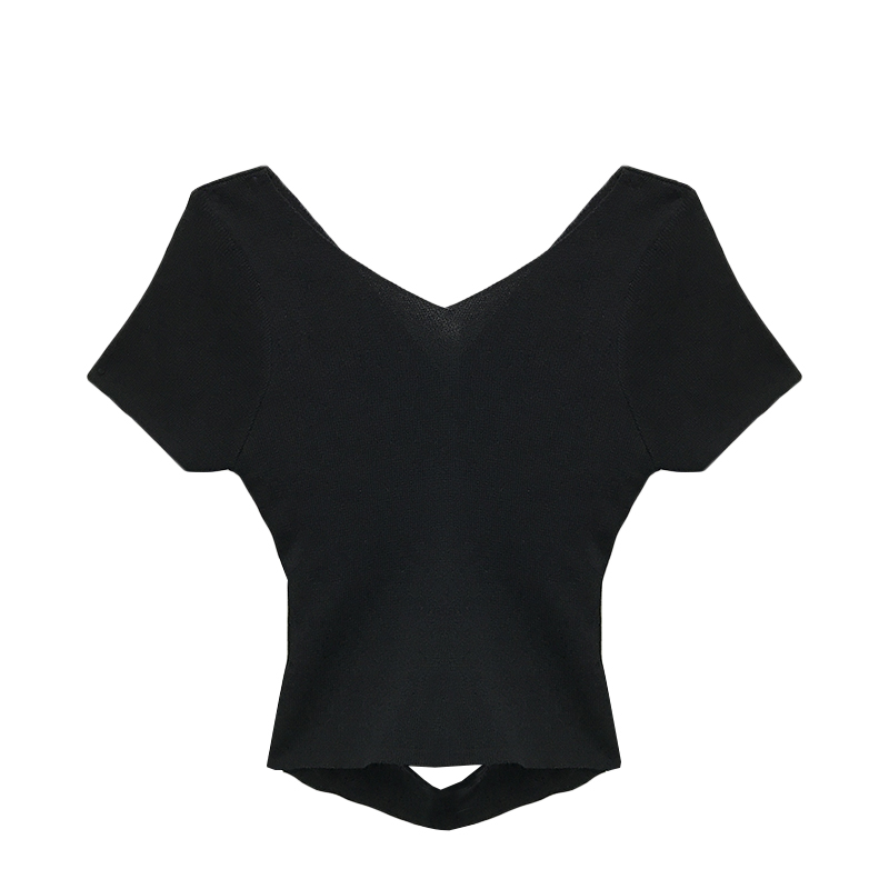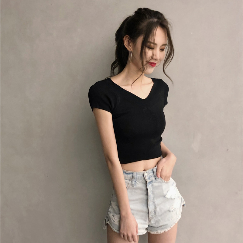 / 夏裝2018新款鏤空短袖針織衫顯瘦露臍上衣修身純色大V領打底衫女