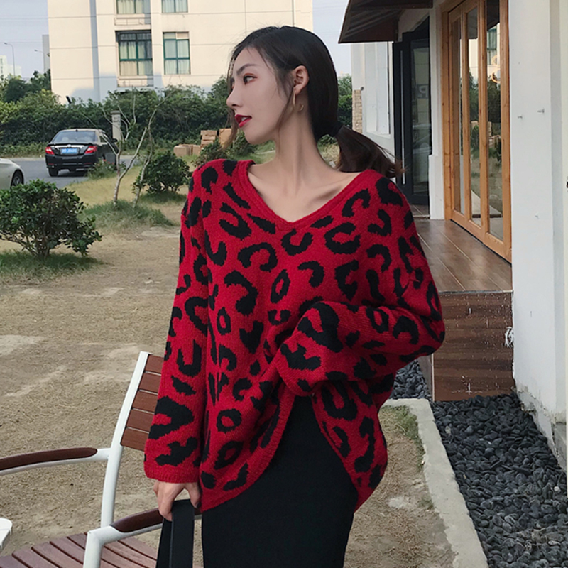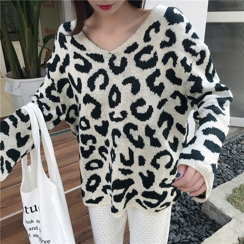 / 港味寬松保暖毛衣秋裝女2018新款復古豹紋長袖針織衫潮流V領上衣