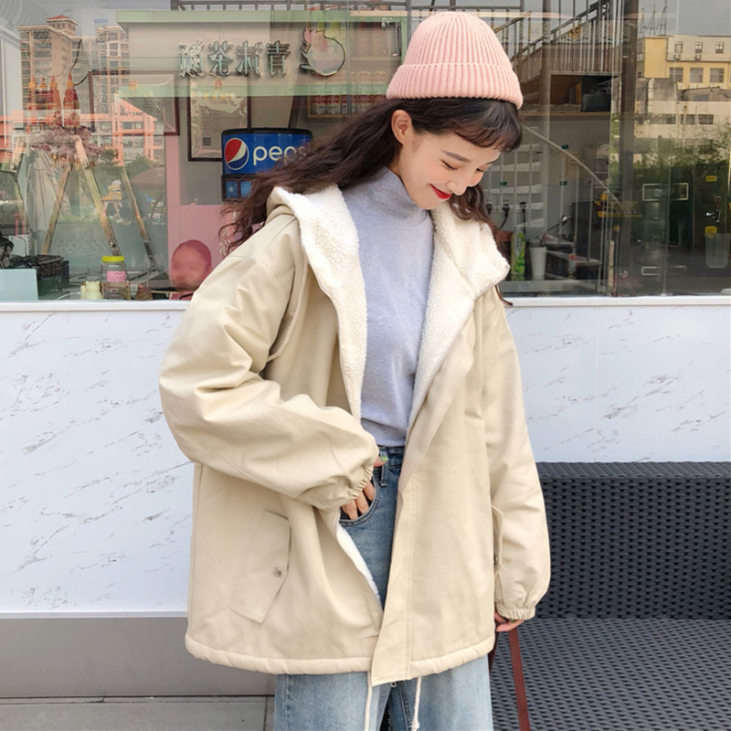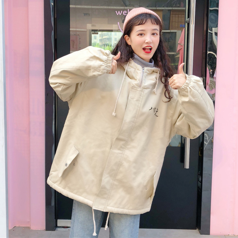 / 原宿風羊羔毛連帽外套女秋冬裝2018新款學生寬松字母圖案棉衣服潮