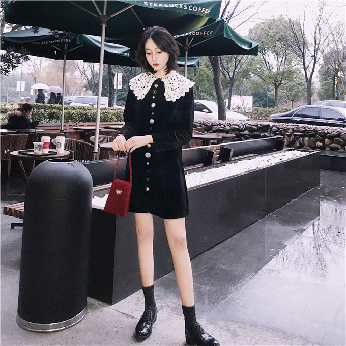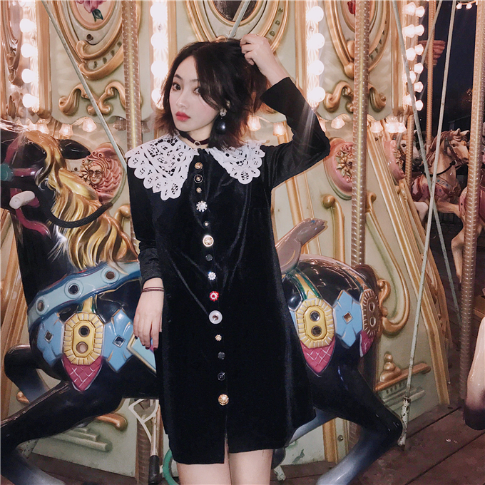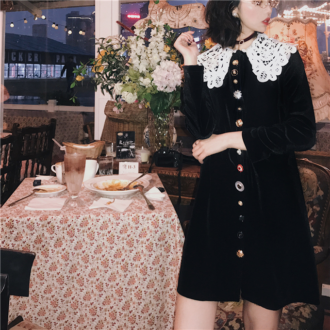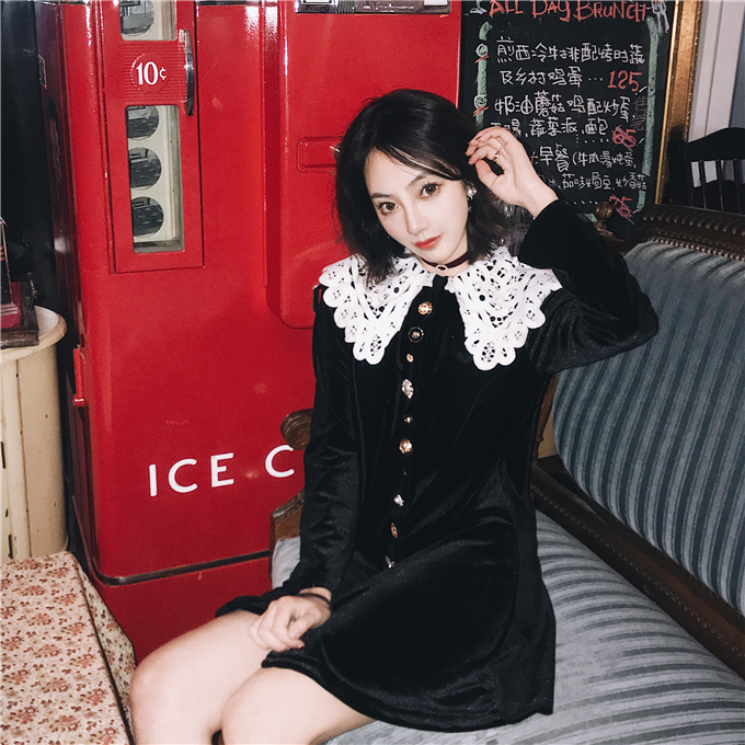 / 秋冬新款chic慵懶風花披肩復古港風蕾絲領鉆石單排扣絲絨連衣裙女