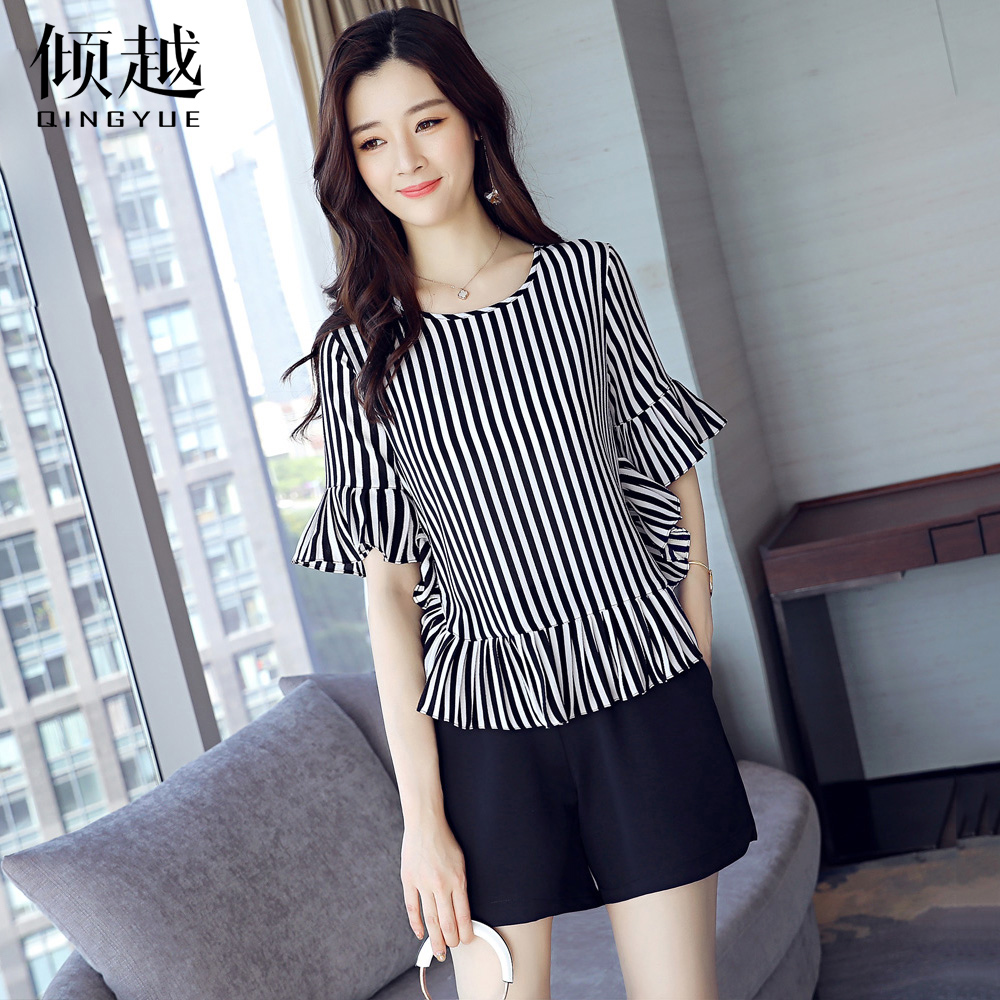 2017夏季新款時尚高腰闊腿短褲套裝女名媛氣質雪紡顯瘦短袖兩件套