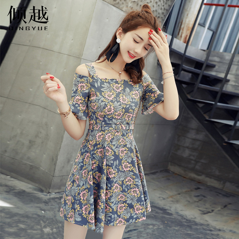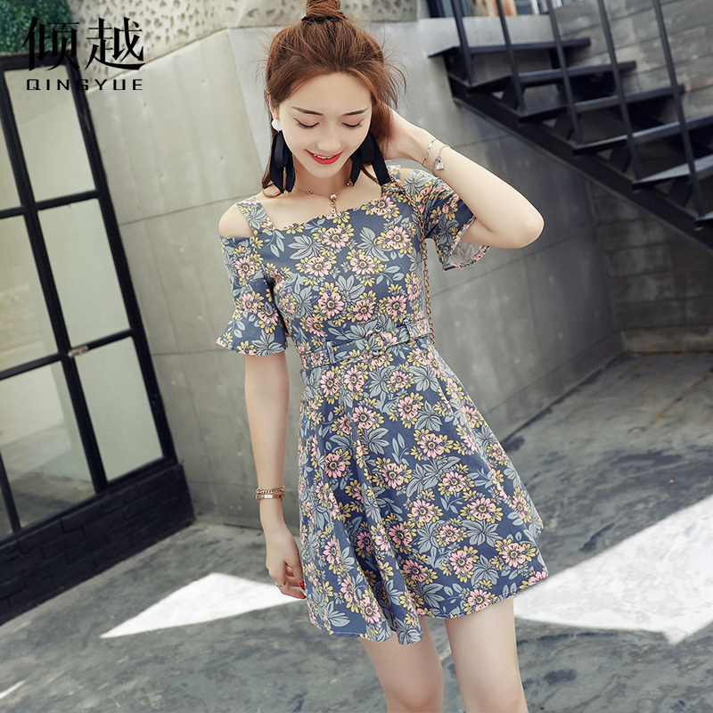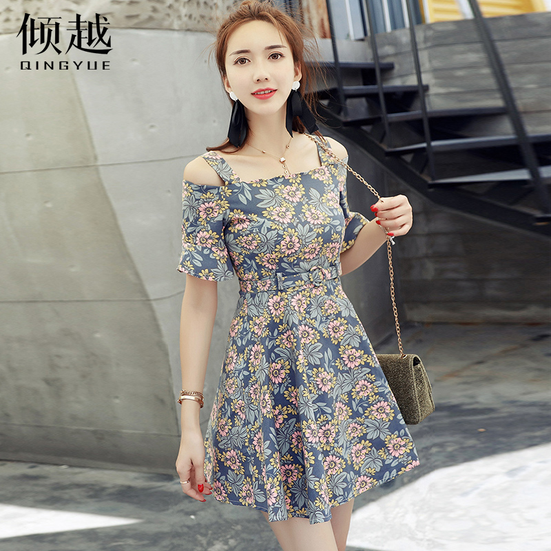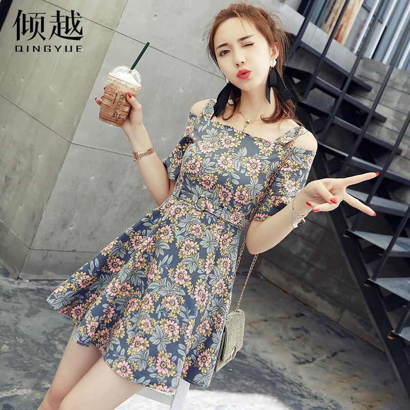 / 2017雪紡連衣裙中長款夏季新款收腰女裝韓版漏肩碎花短袖長裙子潮