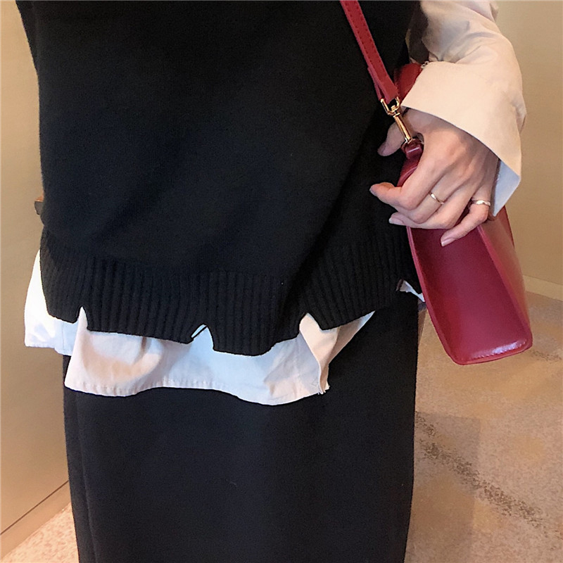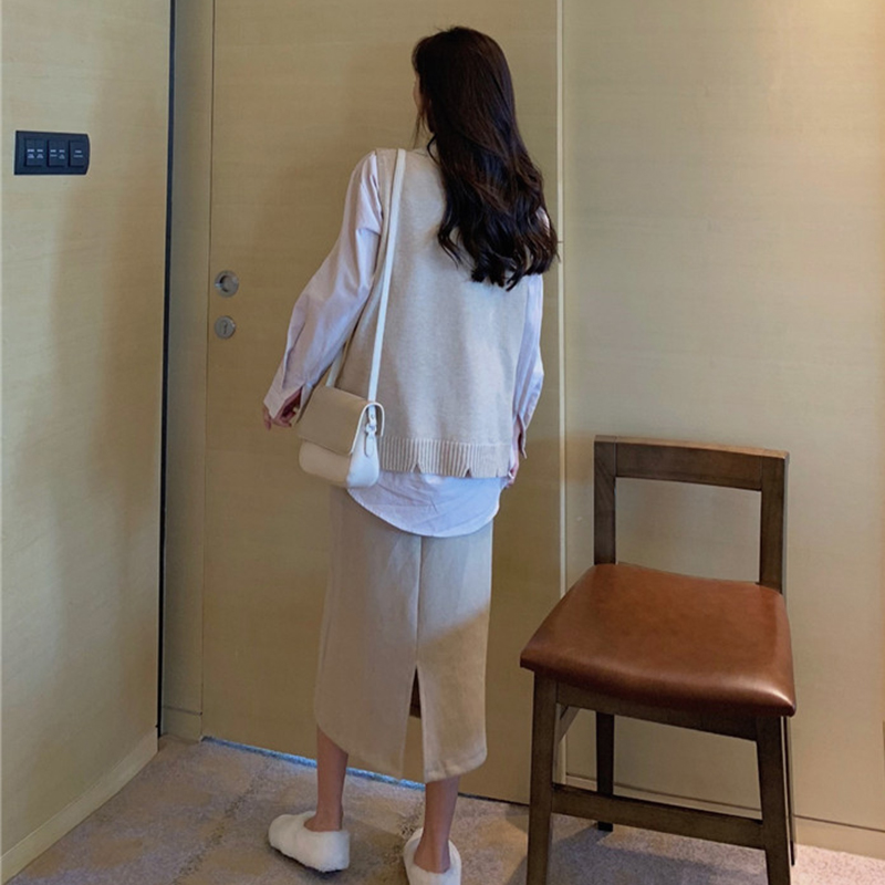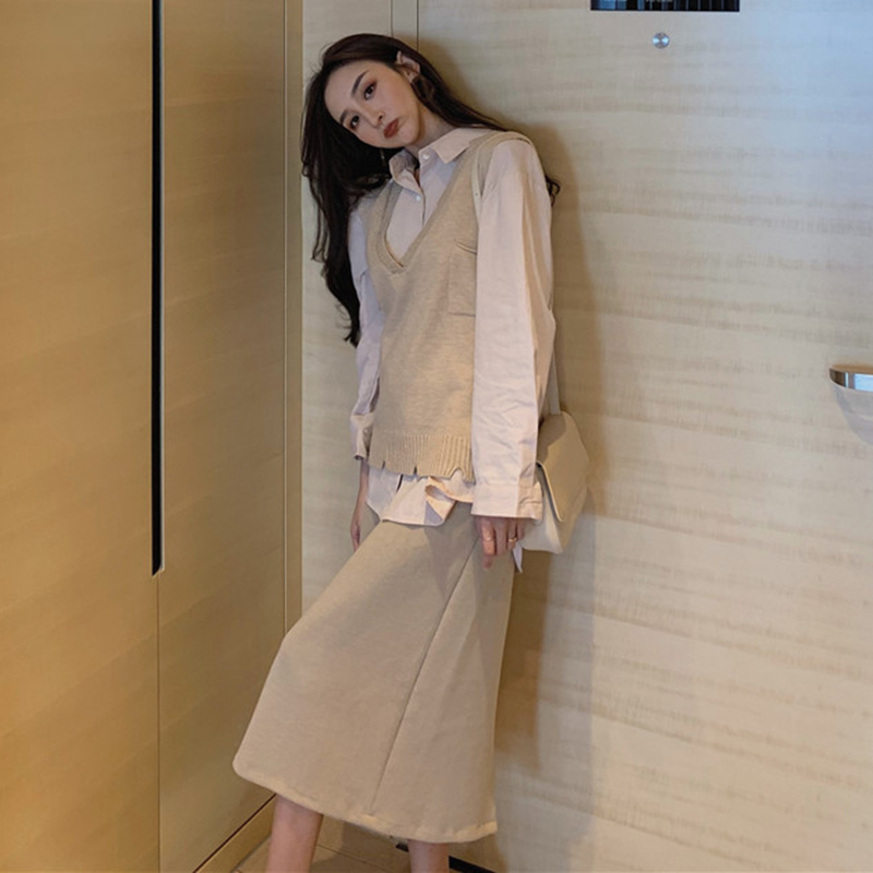 / 時尚套裝女秋冬2018新款復古風針織馬甲背心白色襯衫開叉半身裙子