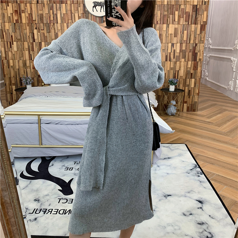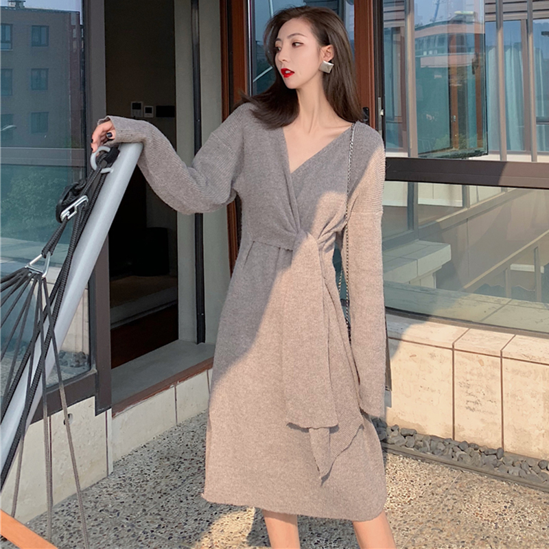 / 氣質V領收腰顯瘦針織連衣裙子女秋冬裝新款復古開叉中長款桔梗裙