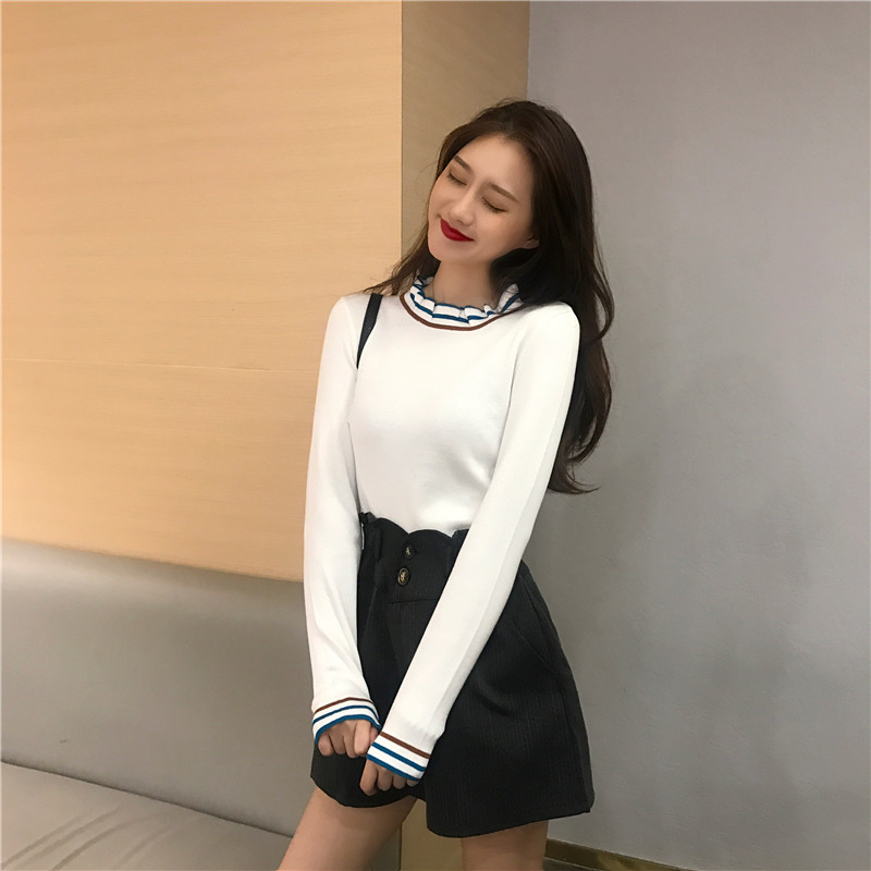 / 韓國復古風毛衣女秋冬2018新款修身顯瘦百搭木耳邊針織打底衫上衣
