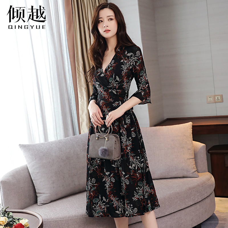 / 傾越春款連衣裙2017新款女夏季韓版七分袖V領中長雪紡印花A型裙子