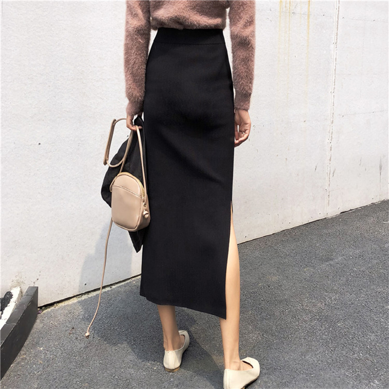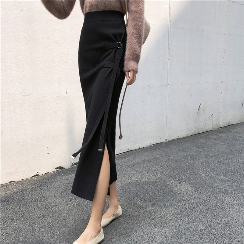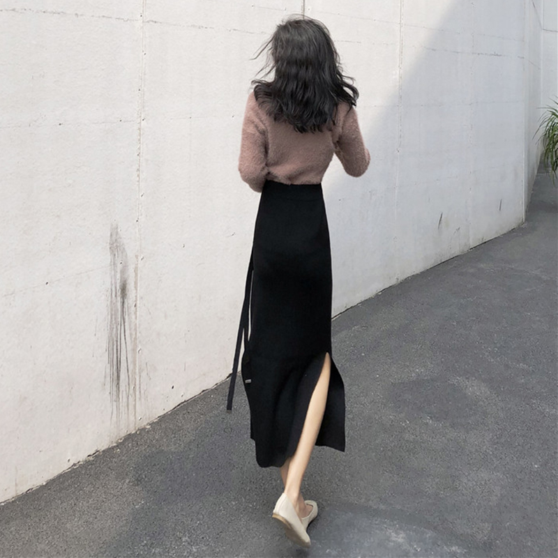 / 中長款開叉針織系帶半身裙女秋冬裝2018新款韓版高腰顯瘦包臀裙子