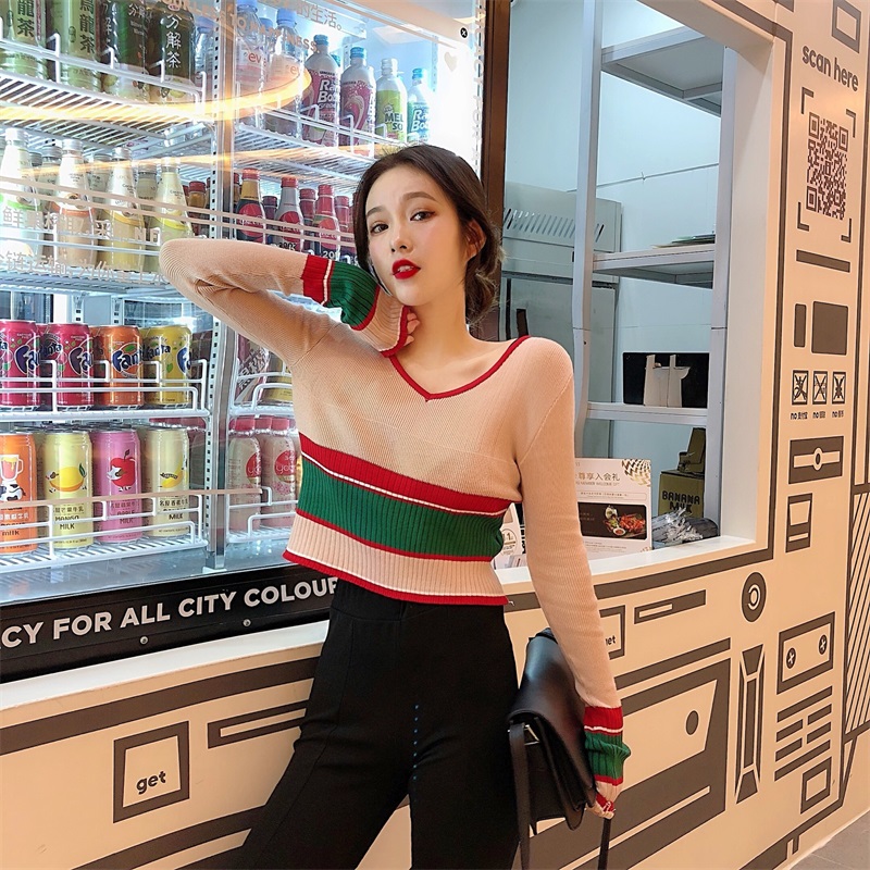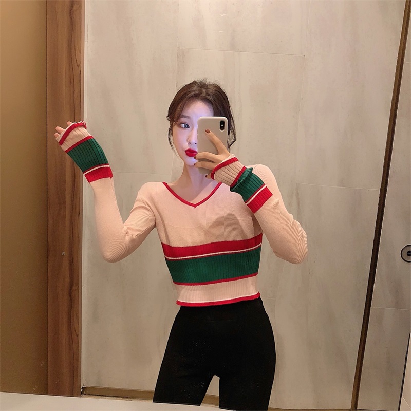 女裝秋裝2018新款潮韓版修身顯瘦V領長袖撞色針織衫百搭打底上衣