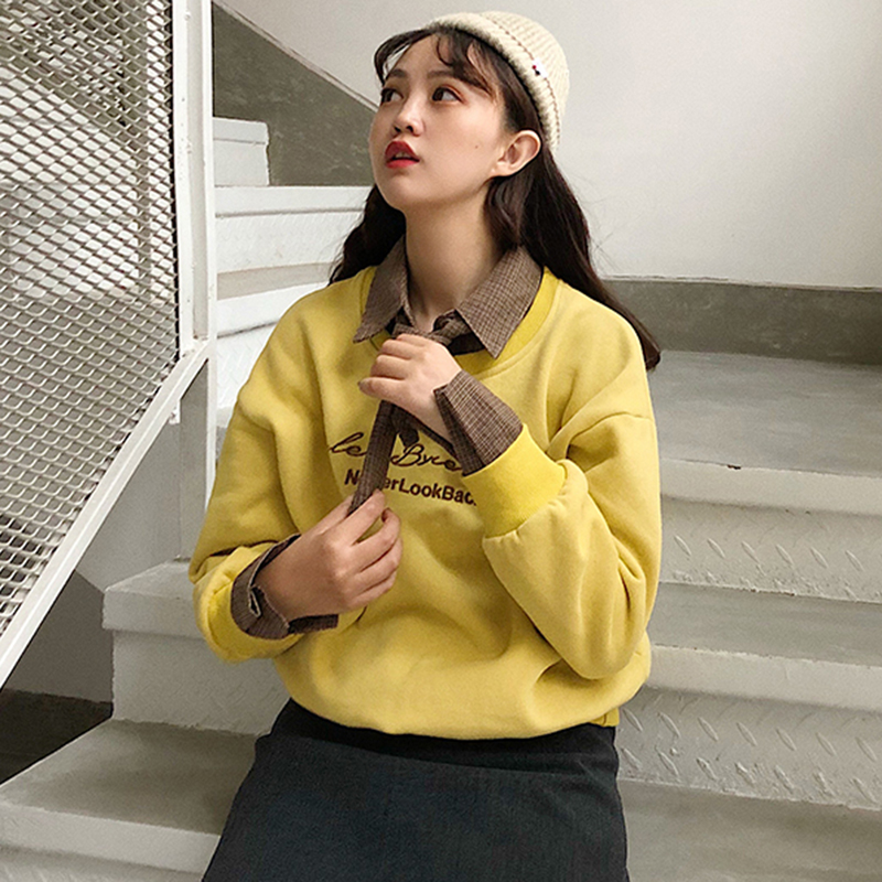 / 領結拼接衛衣2018新款女秋冬裝港風刺繡加絨外套學生寬松長袖上衣
