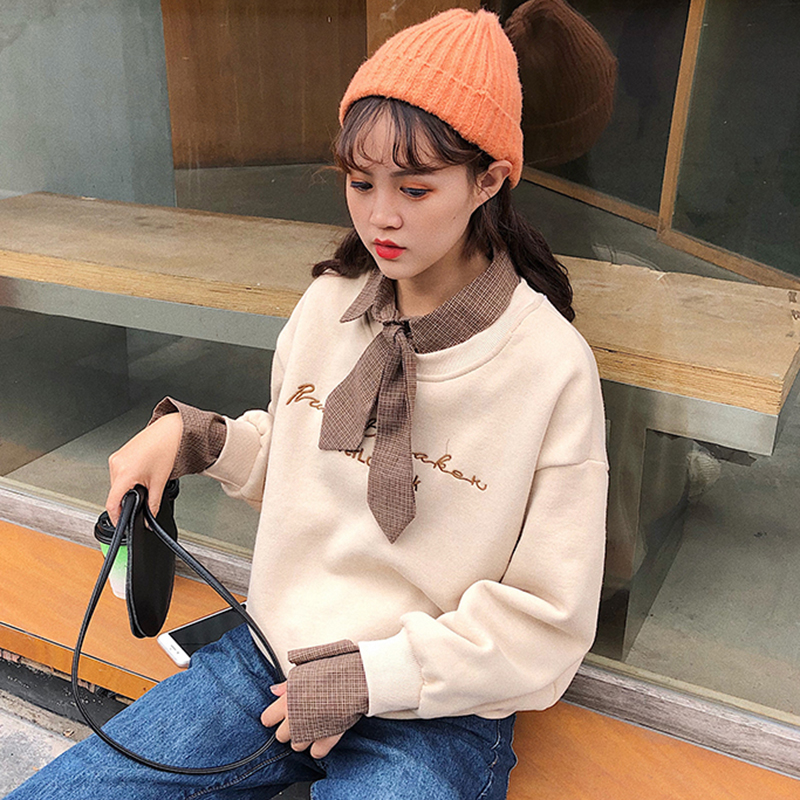 領結拼接衛衣2018新款女秋冬裝港風刺繡加絨外套學生寬松長袖上衣