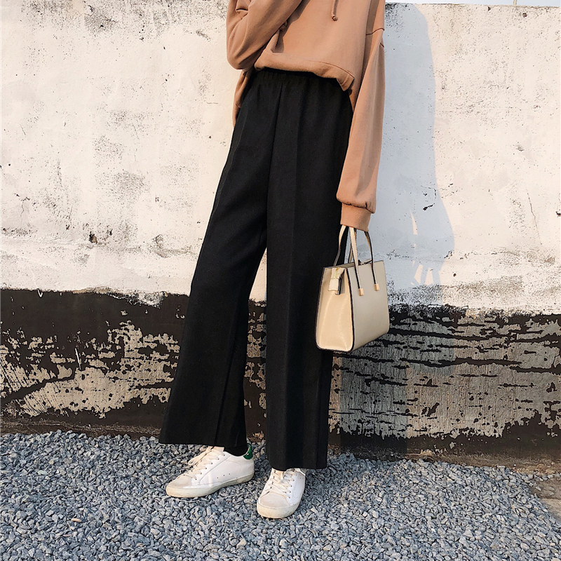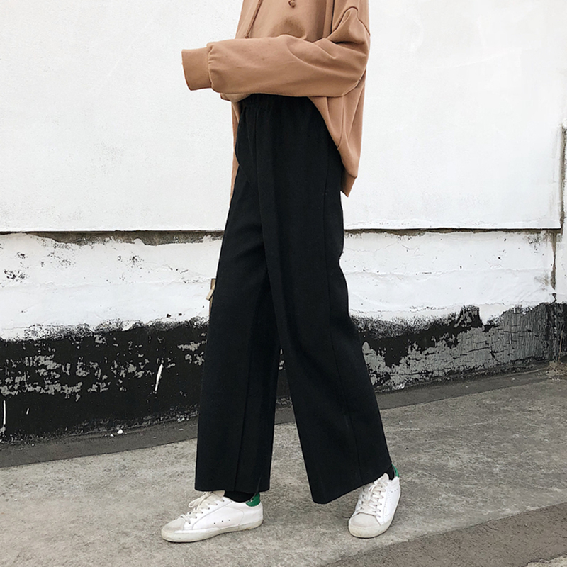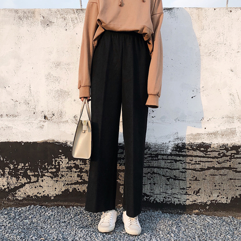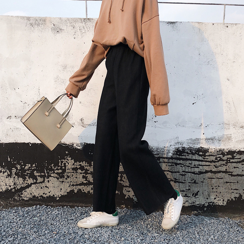 / 秋冬韓版高腰加厚毛呢闊腿褲女裝新款休閑寬松顯瘦黑色直筒褲子女