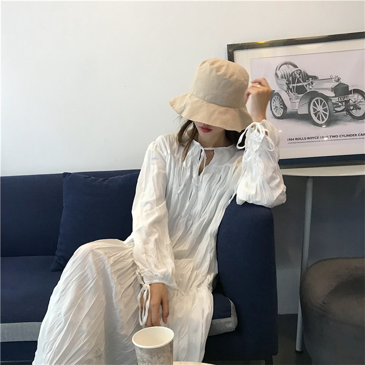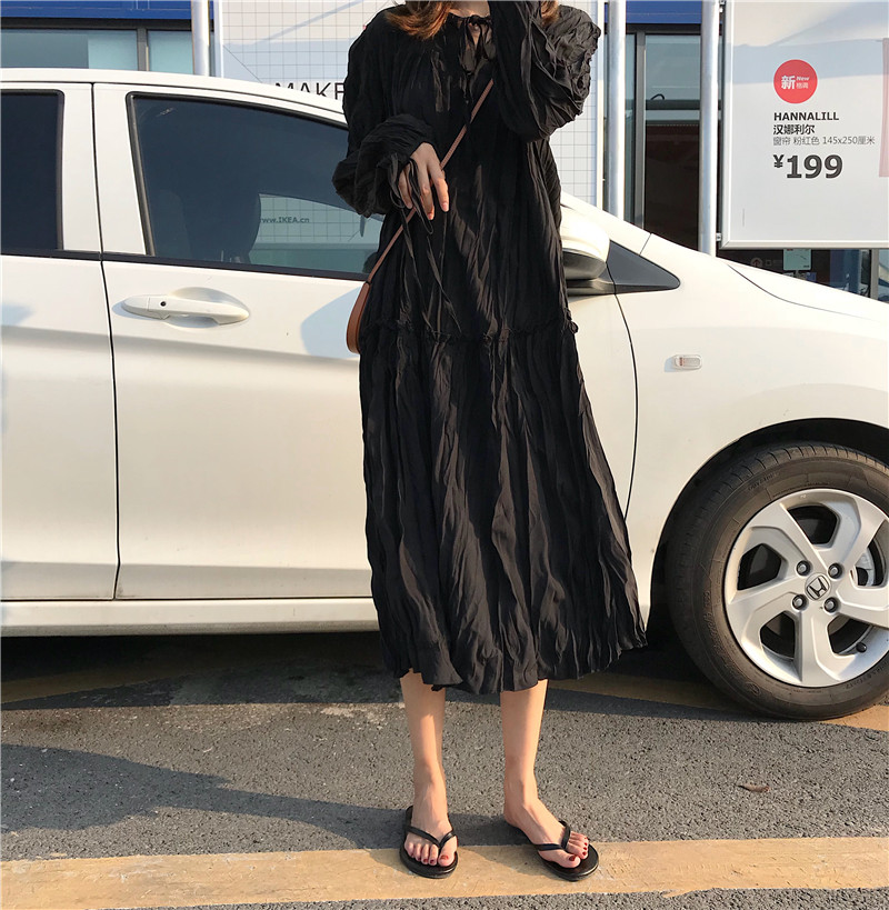 / 晚晚風新款韓版秋季甜美復古chic長裙韓系寬松百搭褶皺純色連衣裙