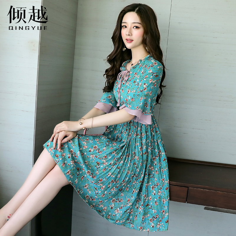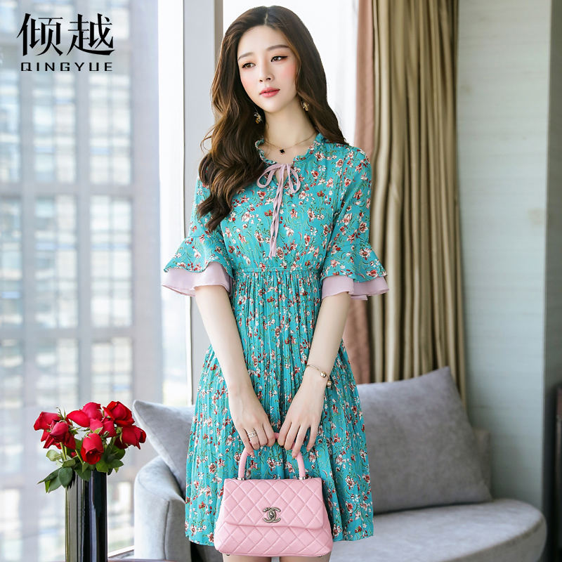 2017甜美小清新淑女雪紡連衣裙韓版碎花松緊腰荷葉袖修身百褶裙夏
